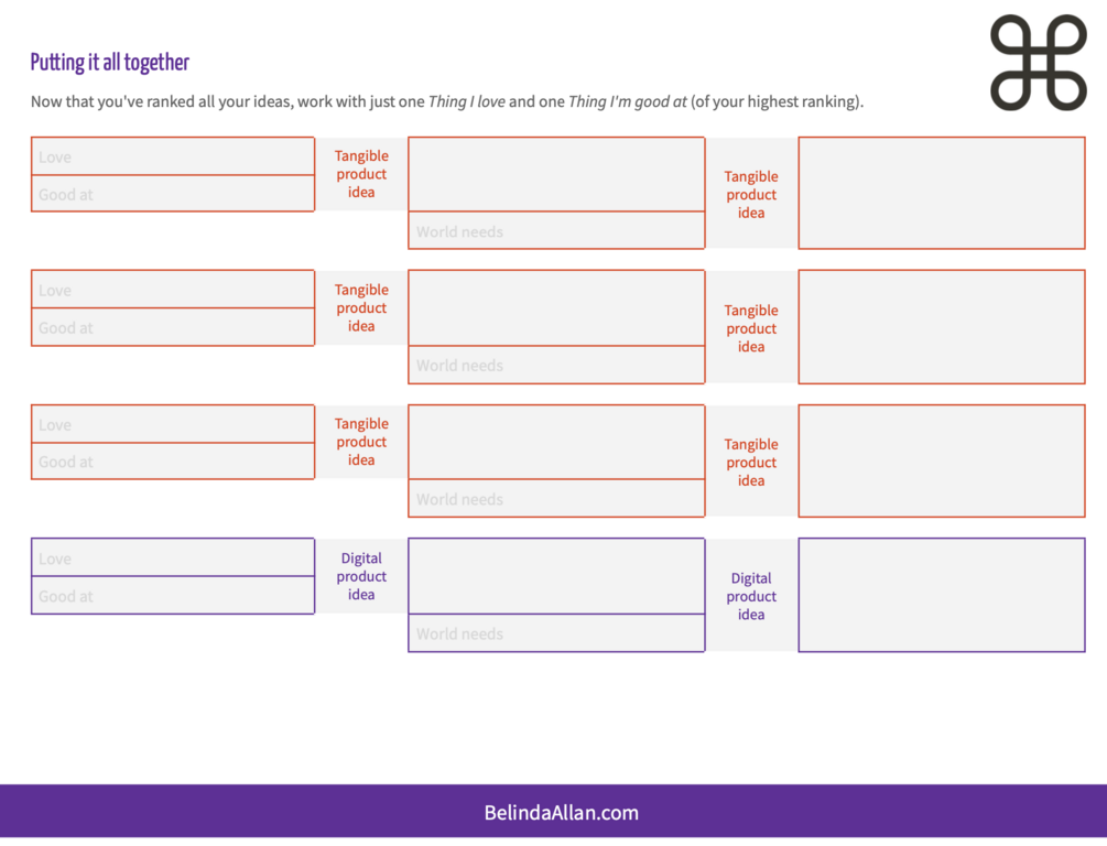 This is a printable worksheet that helps you to brainstorm products and services that align with things you love, are good at and the world needs with plenty of help and examples along the way.